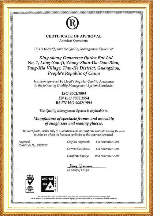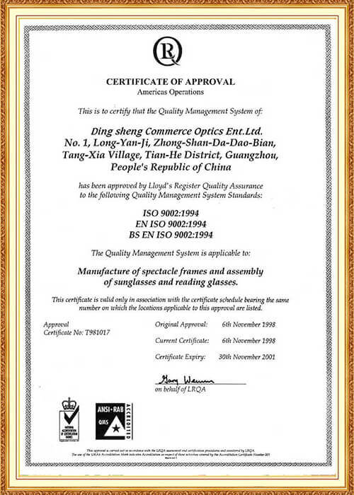 GB-5890-1986(國家(北京)質(zhì)量檢測中心)、QB2475-99(國家輕工標(biāo)準(zhǔn)太陽鏡)